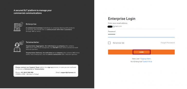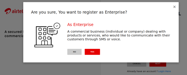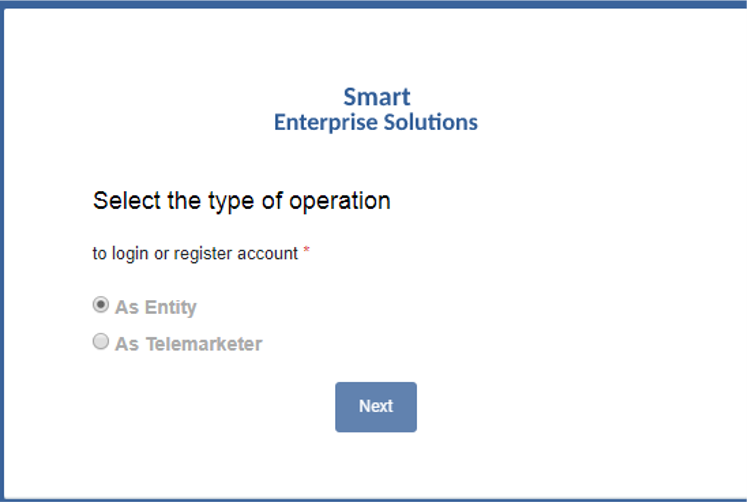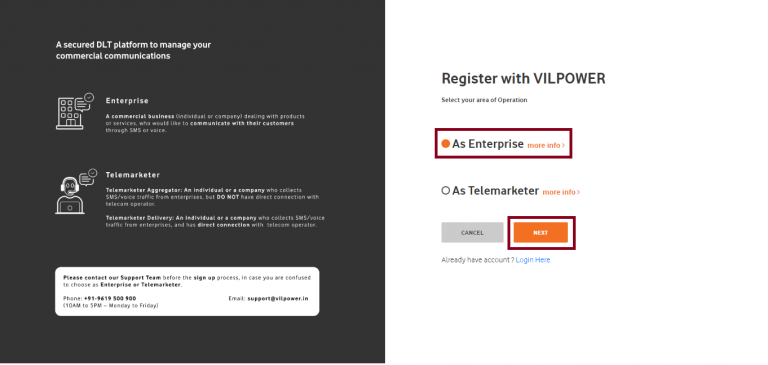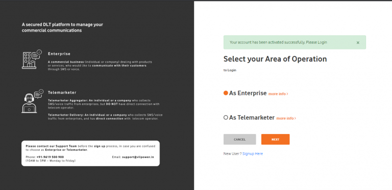 - As you click on the ‘Confirm Email Address’, a message will be displayed on your screen that ‘Your account has been activated successfully, Please Login’. Select the appropriate option between Enterprise and Telemarketer and then click on the Next button.