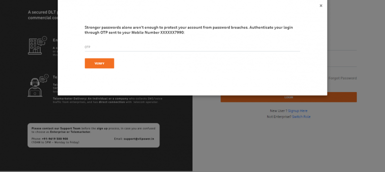- As you click on the Continue button, OTP will appear on your registered mobile number. Enter the OTP and click on the Verify button.Vodafone DLT OTP verification page.