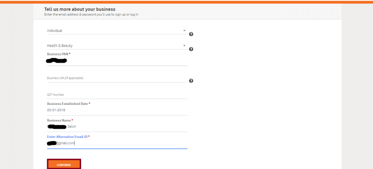- A window will get displayed where you need to enter your business details. As you click on the, ‘Select Industry Type’ field, a number of options will get displayed such as Individual, Sole Proprietorship, Partnership, Private/Public Company Ltd, etc. In the next field, different categories of sectors like Finance, Retail, Health, etc. will be displayed. Select your Business type and Industry from the list and then enter further details. After entering your Business PAN card, Business established date, name and alternative email id, click the Continue button.