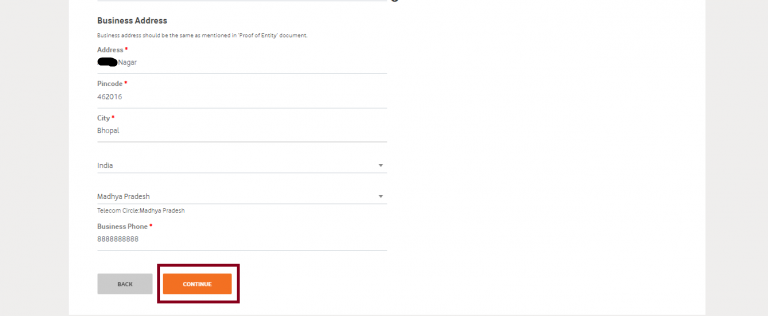 - As you click on the Continue button, another window will get displayed where you need to enter your Business Address details. Enter all the details and then click on the Continue button.