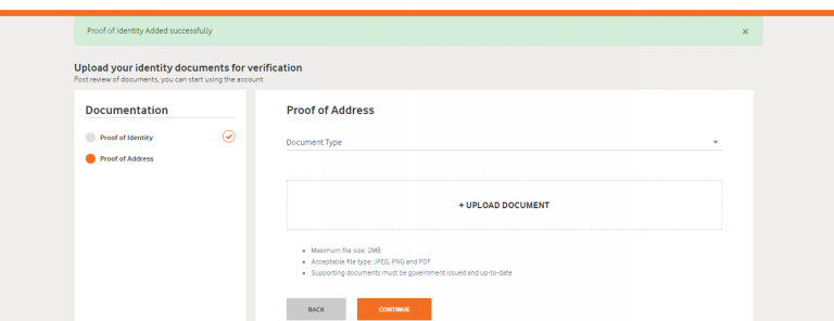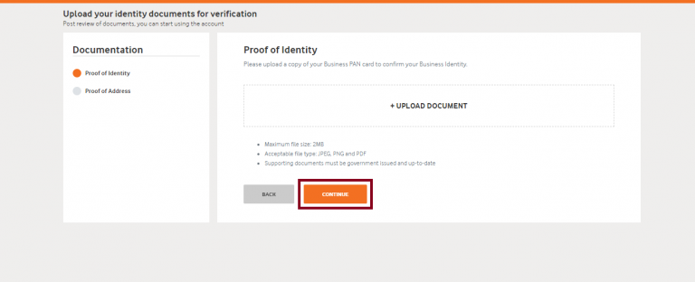 - Attach/upload the valid proofs for PAN & Proof of address as stated in the details entered
