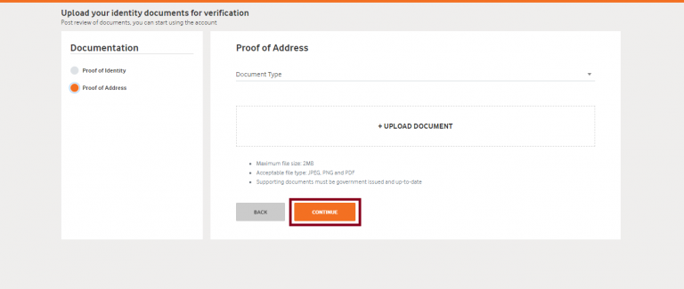 - Next, you need to upload document for the Address Proof. Select the Document Type from the list of options such as Driving License, Voter ID, Passport, attach the document and then click on the Continue button to proceed further.