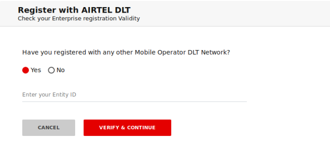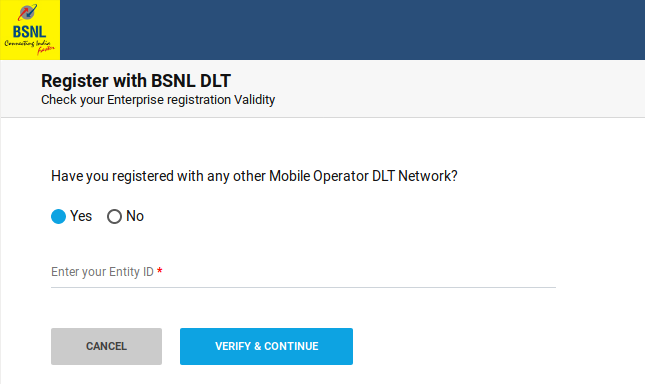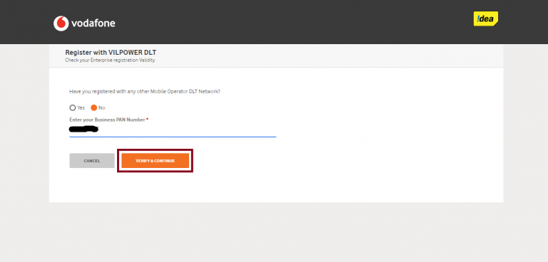 - If you have not registered with any other DLT mobile operator then select the ‘No’ button and then you will be asked to enter your Business PAN number. Enter your PAN card number and then click on the button ‘Verify and Continue‘.