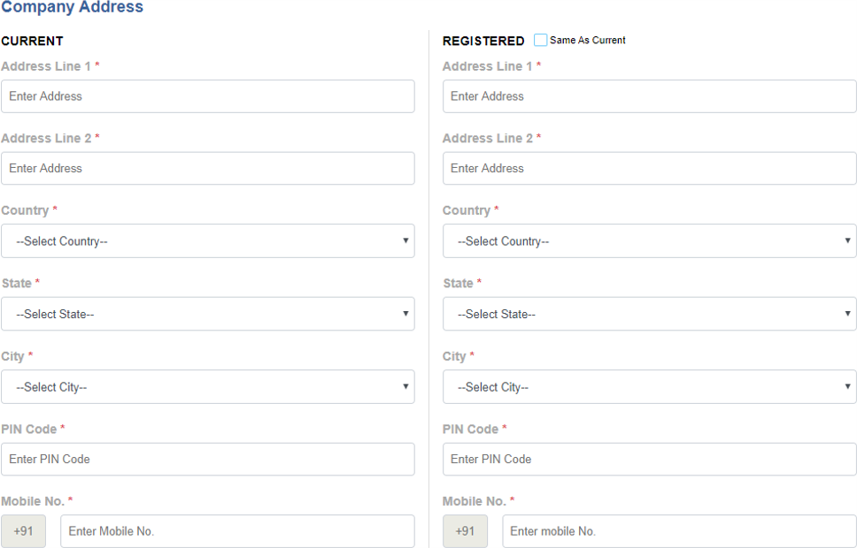 - Company Address *: In this section fill complete current address of the Entity same as per the documents submitted.