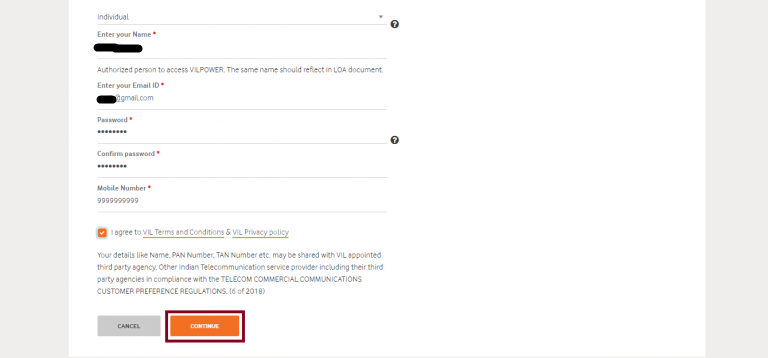- Visit the link – https://www.vilpower.in/signup.