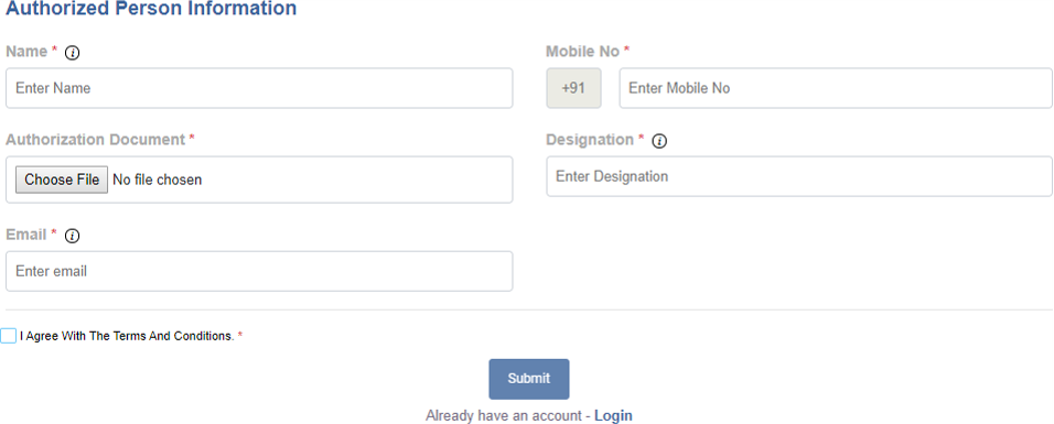 - Provide valid details of the organization - business PAN, complete address, details of authorized person (mobile no. & email ID)