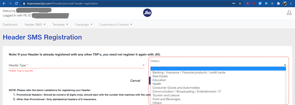 - Fill the requisite details such as header category, Header type, sender ID / header and